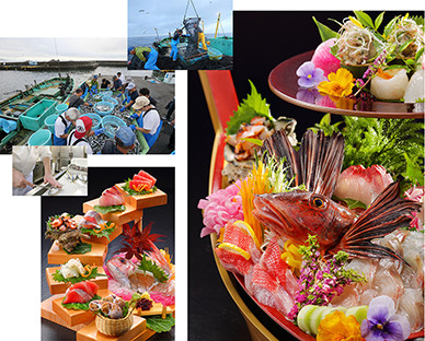 水揚げされた鮮魚は、 港で待ち構える花しぶきリゾート仕入配送スタッフにより直ちに選別され、各店舗へと運ばれていきます。自社保有の定置網からの直送ですので、鮮度を全く落とすことなく、水揚げ後1時間以内に厨房へと届けられます。市場を介するなどの無駄な時間を一切そぎ落とした、花しぶきリゾートならではの究極の仕入れ「漁船直結」を実現しているのです。